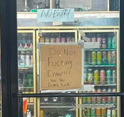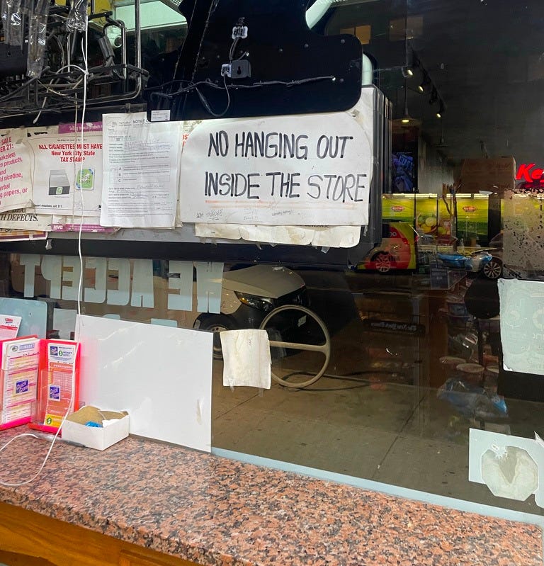 People create traces like this almost without thinking, but intentional changes to the environment, signs both official and unofficial, graffiti, little decorations, or evidence of personalization, are equally telling. Below are two pictures from one Lower East Side bodega. You can safely assume that a) people hang out in the store and b) the operator isn’t exactly a fan of this.