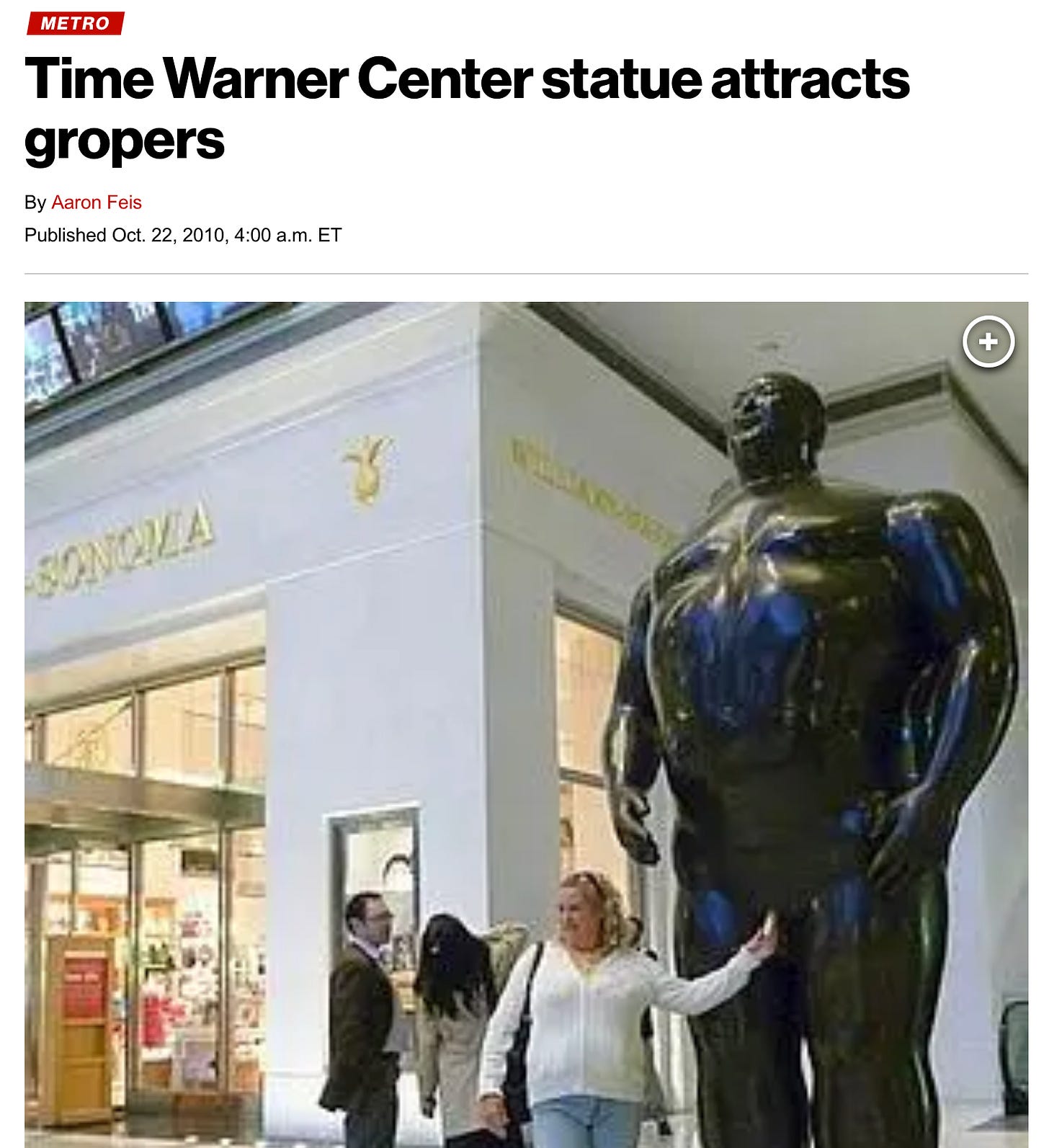 The statue was a dark bronze except for patches that’d been polished to a deep gold: each index finger, the butt cheeks, and the bronze man’s dick n’balls. You can more or less make it out in the picture above. Was this an intentional artistic flourish? Probably not. The bronze on these parts had likely turned this color because people had rubbed them. Good thing the New York Post was on the case.