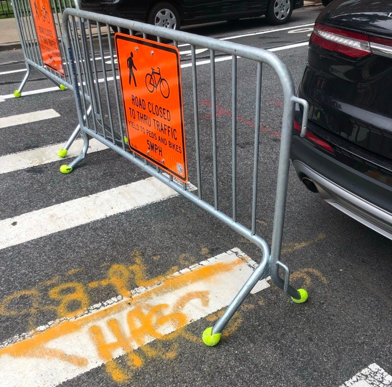Closer to my apartment, the city had just begun its Open Street program and placed metal barriers blocking off Willoughby Ave. Every day while I worked from home, I’d walk along this street during my lunch break and see drivers get out of their cars to slide the barriers aside so they could park. One day I noticed someone had put tennis balls on the aluminum legs of one street’s barriers. I assumed they’d been put there to dull the sound by someone on the block who was working from home, maybe with the window open, and the constant scrape of the barriers was driving them crazy.