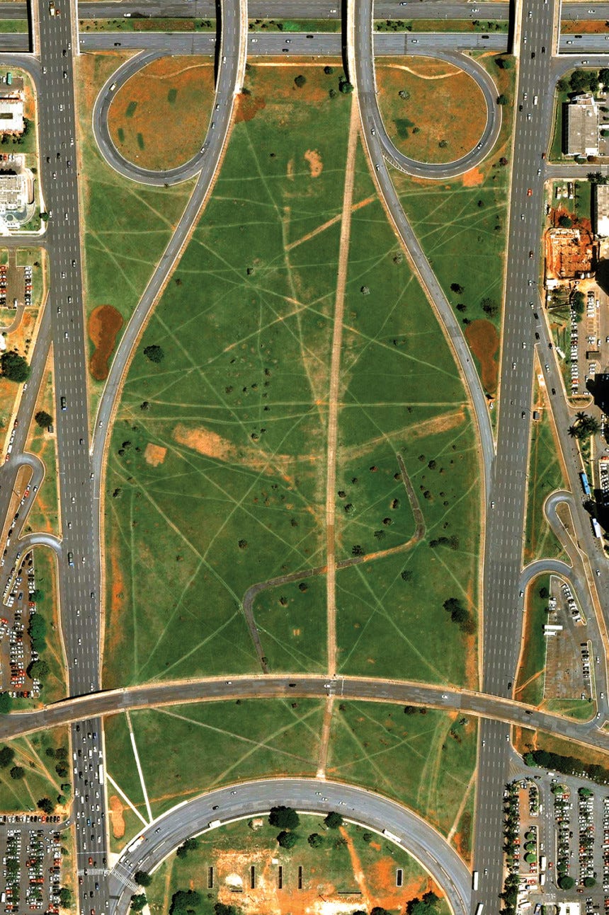 Below is a picture of a green space in Brasilia. You can see the auto roads on its flanks, but if you look closely you can see dozens of faint dirt lines cutting across the grass where people on foot have cut across. This kind of trace is called a “desire line,” an unplanned trail caused by human traffic. The planners of this space failed to anticipate that people on foot, not just in cars, would want to cross this space or build actual paths between the points they wanted to travel between.