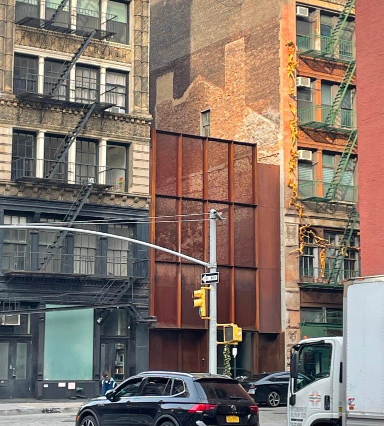 Years later, I was walking through Soho and was struck by a ghostly silhouette of a pitched-roof building preserved on the side of another building. You could clearly see from the change in the color of the brick where the now-gone building pressed against the larger building on the right.