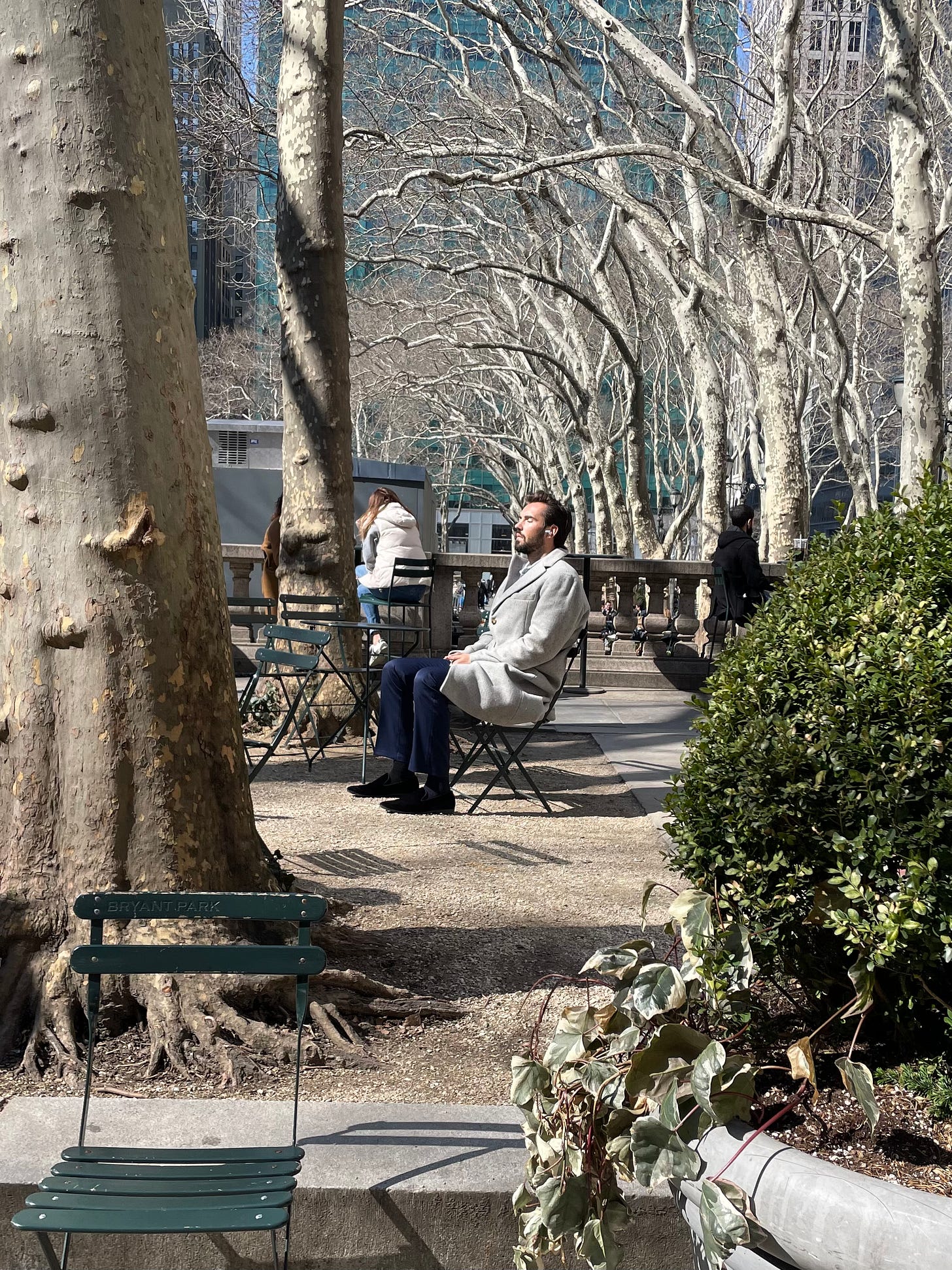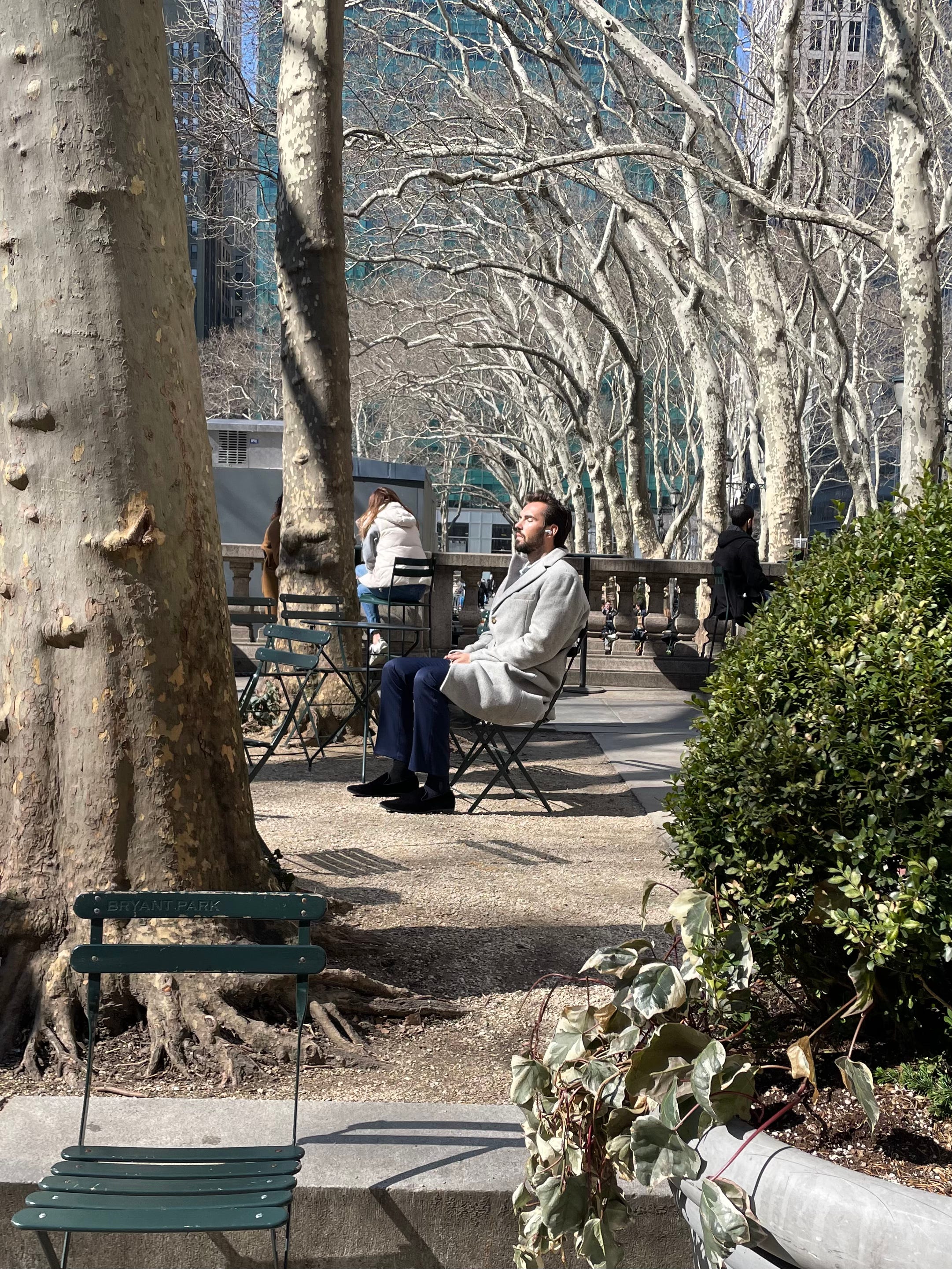 I saw his theory in full effect one sunny winter day when this guy dragged a chair into the path of the sun for some lunch-break vitamin D.