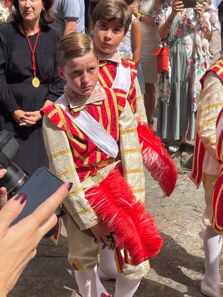 The outfits are amazing. This boy is probably unhappy because it’s 103 degrees and he’s in a lace collar.