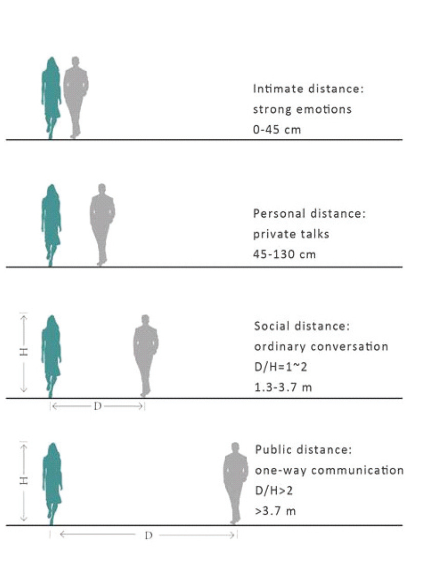 The point is, I think it’s less about some magical ratio and more about narrowness period. Narrowness works not because of what it does for our perception of the sky or other buildings, but what it does for our interactions with people. Seeing each other up close, speaking to one another, and the ability of a relatively small group to fill a space is why narrow streets are perfect for public life. Jan Gehl has developed a scale of distance based not on the sky or building height, but on human interaction. Gehl drew on research to determine the optimal distances for different types of social interaction, such as speaking and looking. People can’t hear each other beyond 100 ft, but 23 ft is ideal for conversation. People can visually make out faces and expressions up to around 325 ft. Edward T. Hall describes Social Distance (no, not that social distance) as around 12 ft, the optimal distance for conversation among friends and neighbors.