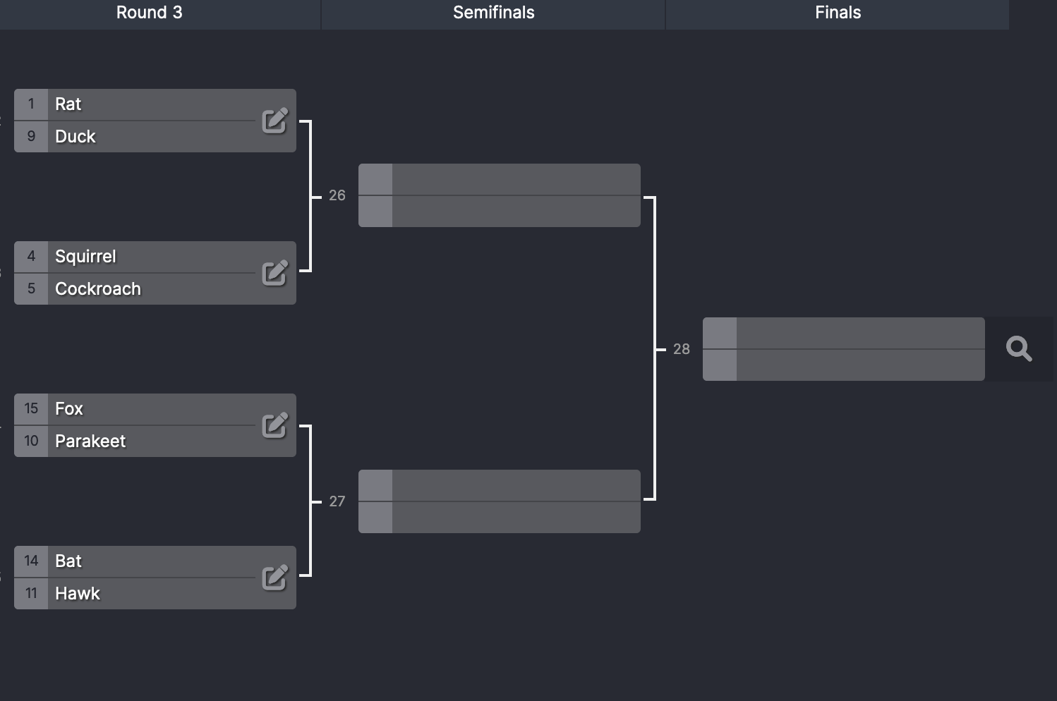Anyway, the rest of the round went pretty much as expected. The Bat and the Cockroach both endured close matches to progress by a single vote. Here is the updated bracket.
